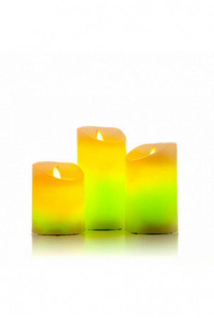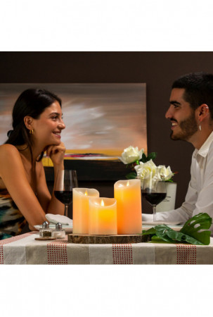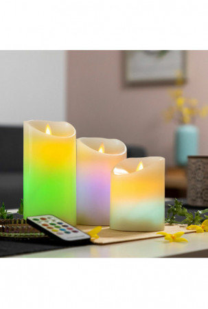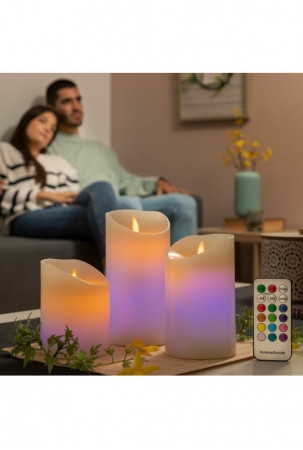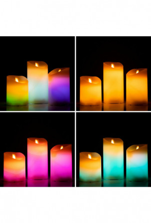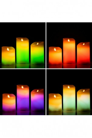 Šios 3 LED žvakės su tikros liepsnos efektu idealiai tinka papuošti aplinką ir sukurti ypatingą, šiltą, intymią, romantišką, šventinę ir pan. Juose yra nuotolinio valdymo pultas, laikmatis, įvairūs apšvietimo režimai ir 12 spalvų šviesa. Jie maitinami baterijomis.