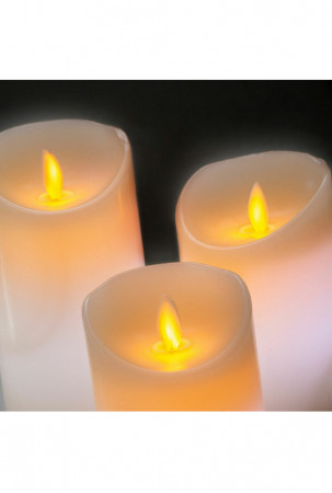 Trijų dydžių elektrinių žvakių komplektas su nuotolinio valdymo pulteliu. Jų parafininė danga mirksi LED liepsna. Ji atrodo labai tikroviškai ir natūraliai.