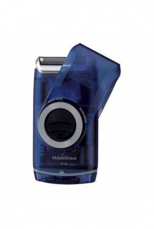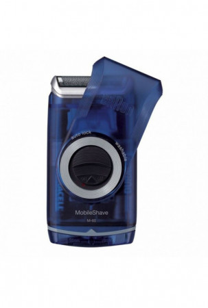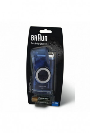 Braun MobileShave M-60b. Skutimo sistema: Tinklelio tipo. Produkto spalva: Mėlyna, Permatomas. Maitinimo šaltinis: Baterija, Veikimo laikas: 60 min. Svoris: 194 g, Pakuotės plotis: 3,5 cm, Pakuotės gylis: 10 cm. Ryšio technologija: Bevielis