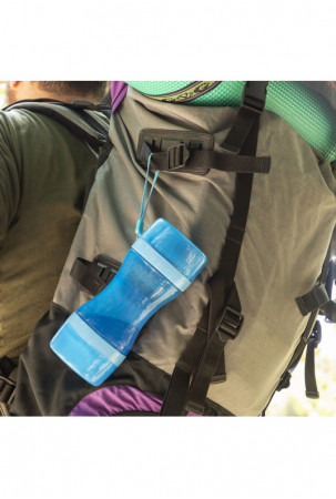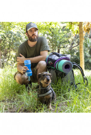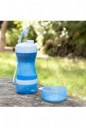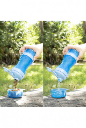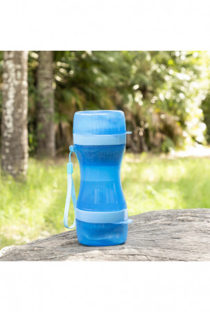 Originalus ir praktiškas butelio formos konteineris maistui ir gėrimui, kuris yra labai naudingas patogiam ir lengvam gyvūnų maitinimui bet kuriuo metu ir bet kurioje vietoje. Vidus suskirstytas į dvi atskiras dalis, iš kurių viena skirta vandeniui, o kita - maistui. Du dangteliai taip pat gali būti naudojami maisto ir vandens pateikimui jūsų gyvūnui. Skyrius lengva išimti ir plauti, o silikoninis uždarymas apsaugo nuo pratekėjimo. Jo inovatyvus nešiojamas dizainas su kabliuku pakabinimui suteikia galimybę ji prikabinti prie kuprinės, ant riešo ar pasidėti į rankinę pasivaikščiojimų, išvykų, kelionių ir kt. metu.