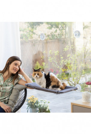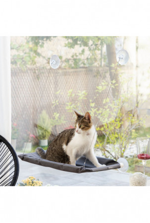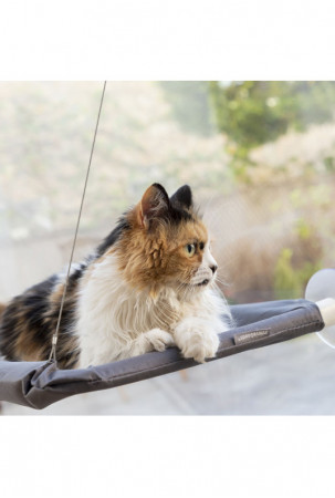 Modernus ir elegantiškas pakabinamas hamakas katėms. Puikiai tinka naminiams gyvūnėliams, kad jie galėtų patogiai mėgautis savo erdve. Tai vieta, kur jie gali mėgautis peizažu, degintis saulėje ir žaisti šokinėdami aukštyn-žemyn, be rūpesčių pasaulyje. Katės mėgsta aukštį, todėl jas sužavės šis pakabinamas hamakas, kurį galima pastatyti bet kokiame aukštyje, efektyviai išnaudojant jūsų erdvę ir išlaikant tvarką. Jį lengva įrengti naudojant 4 stiprius siurbtukus, kurie tvirtai laikosi (nereikia jokių įrankių). Jis atlaiko iki 30 kg svorį. Hamakas daugiausia montuojamas ant langų arba stiklinių durų (vidaus patalpose, ant švarių ir lygių neakytų paviršių). Šis originalus katės hamakas yra labai universalus dėl kelių padėčių dizaino. Jis yra lengvas ir nešiojamas, todėl galite jį lengvai perkelti į naują vietą Jį sudaro keli plastikiniai vamzdeliai ir du pakabinami metaliniai kabeliai, kurie gali saugiai išlaikyti svorį, neleidžiantys katei jų kramtyti ir sulaužyti. „Oxford“ audinio atraminis užvalkalas yra atsparus, kvėpuojantis ir plaunamas rankomis. Jį lengva surinkti ir išardyti pagal pridedamas instrukcijas, o sandėliuojant užima labai mažai vietos.
