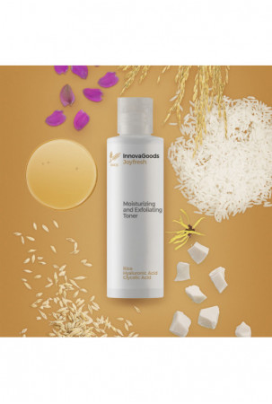 Drėkinamasis ir šveičiamasis veido tonikas su ryžiais „Joyfresh InnovaGoods Rice moisturising and exfoliating facial toner” valo, tonizuoja, skaistina, drėkina, ramina ir subalansuoja PH. Natūralūs ingredientai. Veikliosios medžiagos: ryžių ekstraktas, saponarija, hamamelis, hialurono rūgštis, glikolio rūgštis, pieno rūgštis ir salicilo rūgštis.