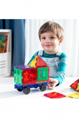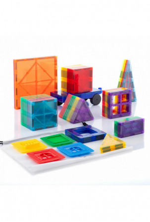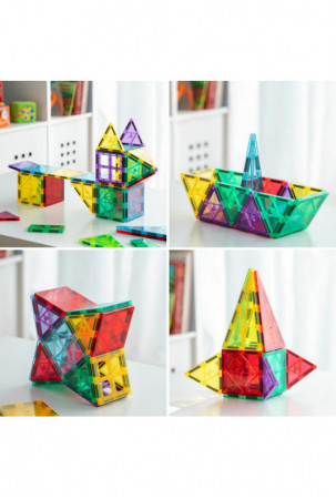 • Magnetinis, įvairiaspalvis: šis 3D konstravimo žaidimas susideda iš permatomų spalvotų skirtingų geometrinių formų detalių, pagamintų iš ABS. Magnetinėse dalyse yra stiprūs magnetai (NdFeB), kurie juos tvirtai laiko kartu ir konstrukcijas išlaiko vientisą.