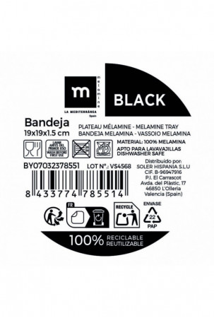 La Mediterránea padėklas yra funkcionalus ir universalus namų ar viešbučių erdvių priedas, sukurtas patogumui ir santūriam stiliui užtikrinti. Šis padėklas išsiskiria matiniu melamino paviršiumi, kuris yra atsparus, lengvai valomas ir modernios juodos spalvos, todėl puikiai dera su įvairiomis aplinkomis ir dekoravimo stiliais. Kompaktiški matmenys 19 x 19 x 1,5 cm leidžia patogiai patiekti užkandžius, gėrimus arba naudoti kaip pagrindą dekoratyvioms kompozicijoms, o tvarkingas dydis palengvina naudojimą ir saugojimą. Pasirinkus La Mediterránea prekės ženklą, garantuojama kokybė ir dėmesys tiek funkcionalumui, tiek dizainui. Šis kompaktiškas ir elegantiškas padėklas yra praktiškas sprendimas ieškantiems ilgaamžio ir įvairiapusiško įrankio, tinkamo tiek stalų aptarnavimui, tiek kasdienei namų ar verslo organizacijai.