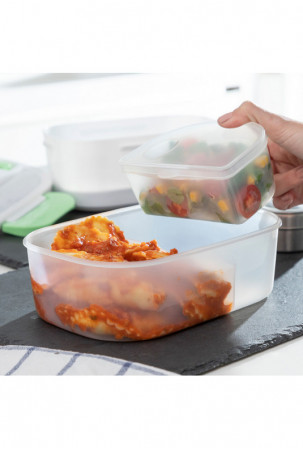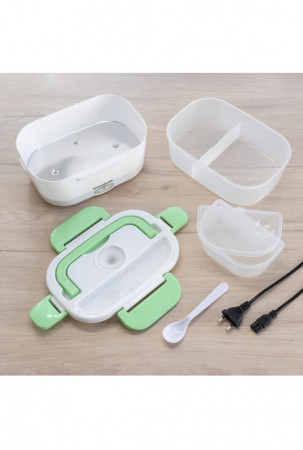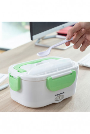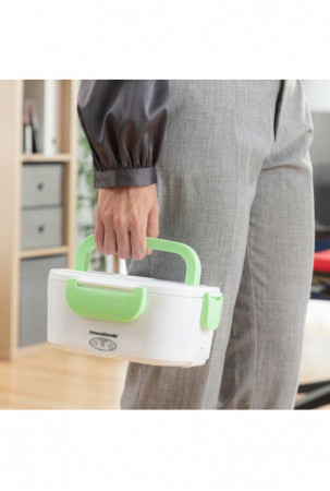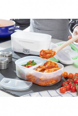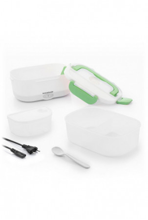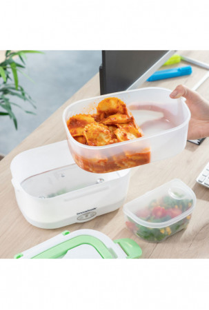 Itin praktiška pietų dėžutė maistui pašildyti arba palaikyti šiltą, nenaudojant mikrobangų krosnelės. Puikiai tinka pasiimti pietus į darbą ir lengvai juos pašildyti biure. Ją paprasta naudoti, tereikia įjungti pietų dėžutę į elektros tinklą naudojant nuimamą laidą (pridedamas), palaukti kelias minutes ir mėgautis šiltu namuose paruoštu maistu. Jos talpa - 1,05 l, o maksimali temperatūra gali siekti iki 70 ºC. Viduje yra nuimamas padėklas su 2 atskirais skyriais ir mažesnis indas su dangčiu, kuris taip pat nuimamas, todėl abu indaplovėje galima lengvai išplauti. Indas su dangčiu pravers salotoms ar desertams, o kitas - maisto produktams, kuriuos norite pašildyti. Pietų dėžutės dangtelis turi garų išleidimo vožtuvą ir stalo įrankių skyrių, kuriame yra šaukštas. Ji taip pat turi 4 apsauginius užraktus jam uždaryti ir atlenkiamą nešiojimo rankeną, kad būtų patogiau ją bet kur pasiimti. Ją taip pat galima naudoti kaip įprastą pietų dėžutę šaltam ar šviežiam maistui.