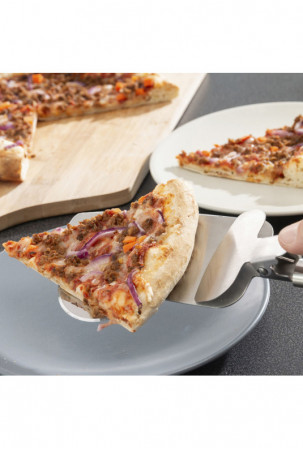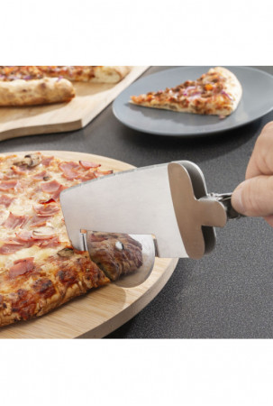 Originalus ir praktiškas picos pjaustytuvas, inovatyvus ir išpildytas dizainas, kadangi jame yra pjaustymo ratelis, specialūs ašmenys kraštams, mentelė atpjautiems gabaliukams ir žnyplės.